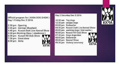 Come to the KK9A dog show this weekend - taking place at Mishref Exhibition Hall #7 on December 2 and 3. It is free and open to the public. Bring your kids. Get great dog advice from trainers and breeders on site. Show takes place indoors for your comfort. See the KK9A FB page for more information on the group at https://www.facebook.com/kk9ateam/